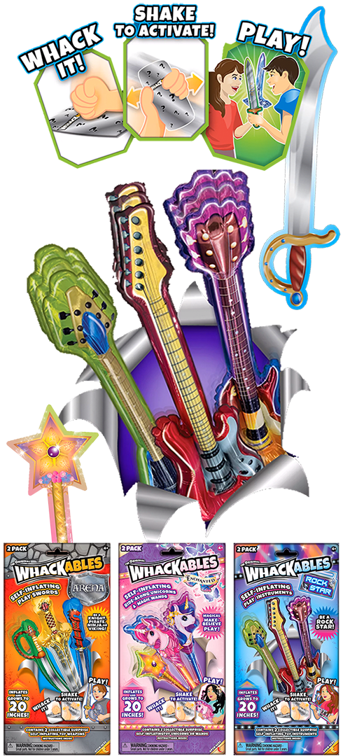 With innovative self-inflating mechanism and full-color, exciting illustrations of pirate swords, keytars, unicorns and more, these toys are just a whack, shake and play away.